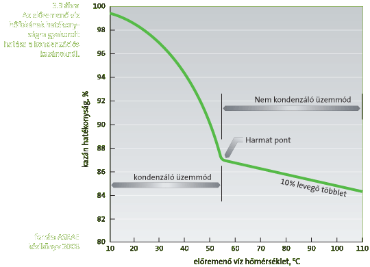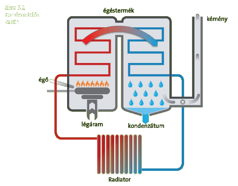 A kondenzációs kazán a gáz vagy olaj elégetése során hőjét leadja a fűtés rendszerbe és szerkezete úgy van kialakítva, hogy az elsődleges hőcserélőt követően a füstgázok lehűljenek benne, egészen addig, míg a füstgázban lévő vízgőz kondenzálodik, és párolgáshőjét leadja a kazánban keringő víznek mielött az visszatér a fűtés rendszerbe. (3.2 ábra). A fűtéshez ugyan gáz és olaj is használható, de a gáz használata jóval hatékonyabb, hiszen a gázzal fűtött rendszerekben a víz 57°C-on kondenzál, míg az olajjal fűtött rendszer esetében 46°C-on. A gázzal fűtött rendszer másik előnye az égéstermék magasabb víztartalma.