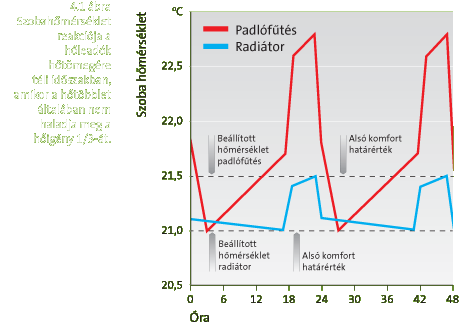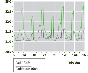 A szobahőmérséklet növekedésére és csökkenésére adott reakció alapelvét a 4.1-es ábra mutatja, amely két rendszert hasonlít össze. A gyors reagálásra képes, kis hőtömegű radiátoros fűtési rendszer esetében a hőtöbblet 0,5°C-al növelte a szoba hőmérsékletét, ezáltal közel tartva az elvárt 21°C-hoz. A nagy hőtömegű, hagyományos padlófűtés nem képes a szobát állandó hőmérsékleten tartani. A kutatás kimutatta, hogy a szoba hőmérsékletét 21.5°C-ra kell beállítani, az alsó 21°C-os komforthatár felett. A hőleadó puszta mérete miatt folyamatosan késve reagált a hőigényre, amely erős hőmérsékleti ingadozást és energiaveszteséget eredményezett.