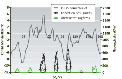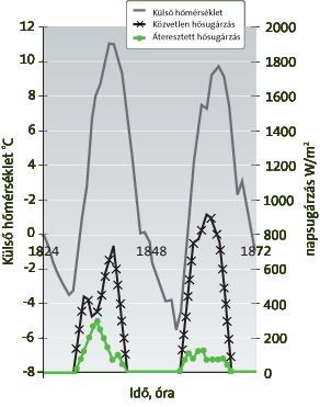 Egy enyhébb évszakban a hőnyereség közel azonos a fűtési igénnyel, amely még bonyolultabbá teszi a szoba hőmérsékletének szabályozását. A 4.3-as ábra egy kétnapos teljesítményt mutat, márciusban mérve. Jelentős a napsugárzás és a kültéri hőmérséklet nagymértékben ingadozik. Ebben az esetben is a radiátoros fűtés bizonyul a kiegyensúlyozottabbnak, és sokkal egyenletesebben tartotta a szoba hőmérsékletét, miközben alkalmazkodott a hőingadozáshoz.