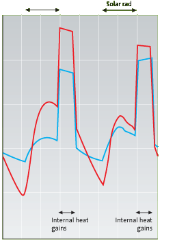 A 4.1-es ábrán bemutatott példa részletes, dinamikus szimuláción alapszik, amelyet modern német otthonokban végeztünk. A 4.2-es ábra a január első hetében mért szobahőmérsékletet mutatják. Mivel a napsütés és a belső hőforrások által generált hőtöbblet nem becsülhető, a padlófűtést nem lehet prediktív vezérlésre állítani. A hőtöbblet ugyan kikapcsolásra készteti a padlófűtést, de az ezután még jelentős ideig hőt sugároz a külső hidegebb felületek felé, mint például az ablakok és a külső falak. Ez túlfűti a szobát.