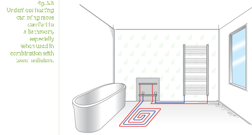 Central heating system where the heating water temperature is typically under 45°C at design weather conditions. The most typical embedded system is the underfloor heating using floor surfaces for heat emission. Heat emission to the rooms occurs in the form of heat radiation and natural convection. Suited to those buildings with higher heat demand and bigger thermal masses. Particularly comfortable in bathrooms (Fig. 5.3), and useful in hallways near external doors, to aid evaporation of water brought in from outside when raining. Lower emission energy efficiency than low temperature radiator heating.