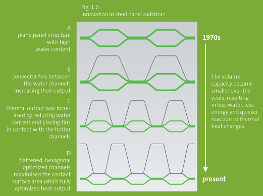 Radiators have come a long way from the bulky column designs of 40 years ago (Fig. 1.2). The early steel panel forms had a plane panel structure and high water content (A). Next came the introduction of convector fins between the water channels, increasing their output (B). Over the years, it was discovered that the thermal output could be increased by reducing the water content and placing the fins in contact with the hotter channels (C). It wasn’t until the channels were flattened, in the hexagonal optimized form illustrated here, that the contact surface area was maximised and heat output fully optimized (D).