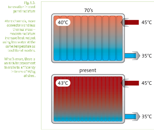 - Innovation of radiators > Reducing the water content and placing the fins in contact with the hotter channels has increased thermal output. With today’s designs, the material is up to 87% more efficient than in traditional models