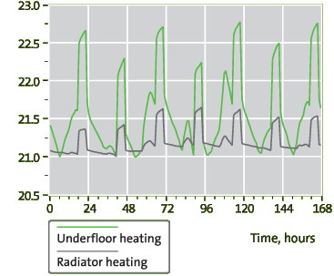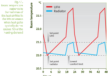 The principle of the room temperature response to heat gains and losses is shown in Fig. 4.1 where two systems are compared. In the case of fast-reacting radiator heating systems with small thermal mass, the heat gains elevate room temperature not more than 0.5°C, keeping room temperature close to the setpoint of 21°C. Traditional underfloor heating with high thermal mass fails to keep room temperature constant. Research showed that the setpoint had to be increased to 21.5°C to keep the room temperature above the lower comfort limit of 21°C. The sheer size of the heat emitter meant its output was lagging behind the heat demand, resulting in strongly fluctuating room temperature and wasted energy.