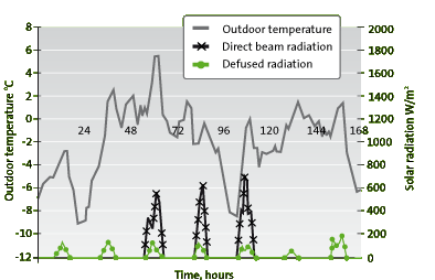 Simulated room temperatures, first week in January. Outdoor temperature, solar and internal and external heat gains are shown on the left.