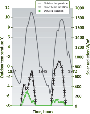 In midseason, heat gains are close to heating needs, which makes it more complicated to control room temperature. Fig. 4.3 shows the performance during two days in March. Solar gains are significant and outdoor temperature fluctuates strongly. Once again, radiator heating resulted in more stable room temperature and better utilisation of heat gains.