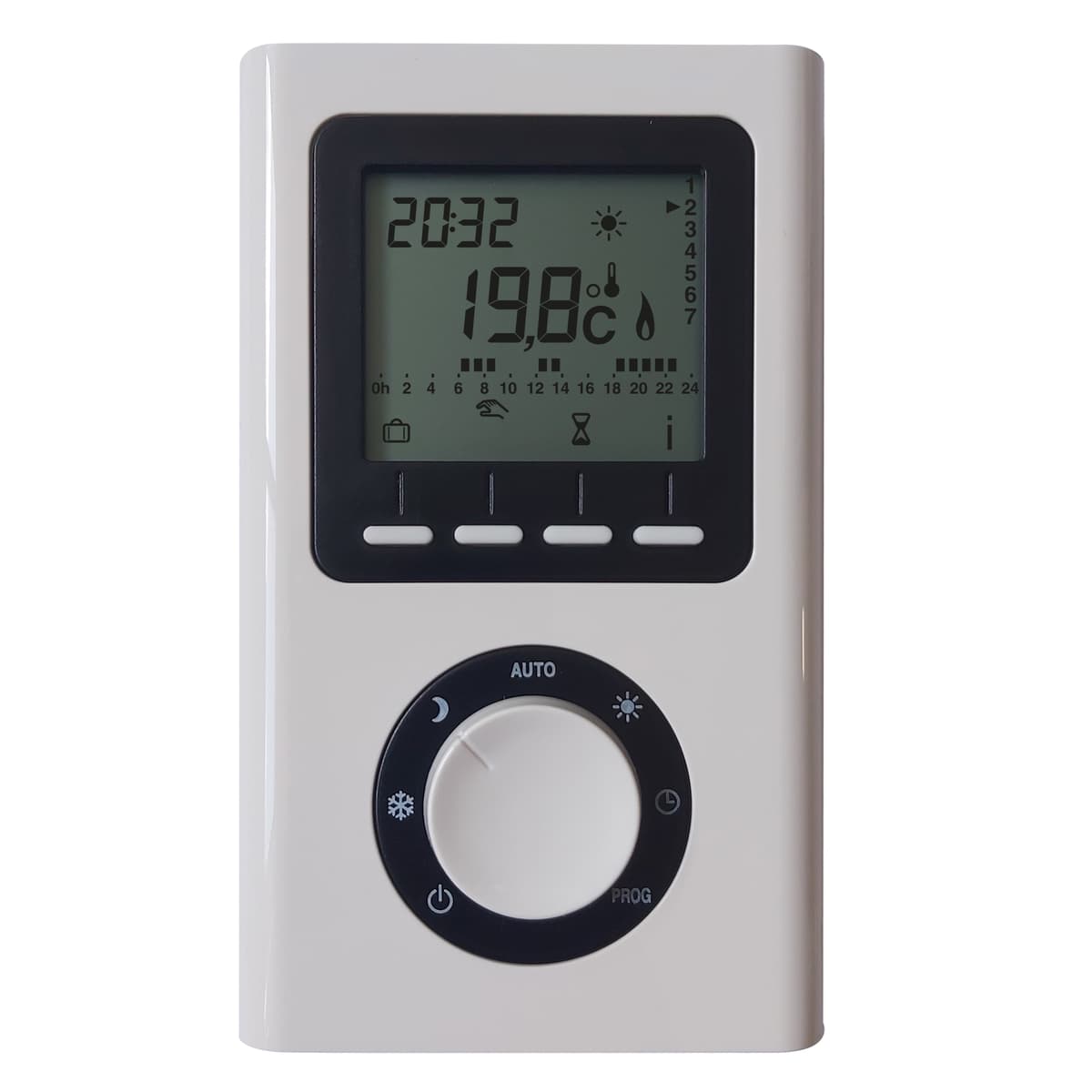 Fjernbetjeningen Figuresse er designet til at give avanceret temperaturkontrol i bolig- og erhvervsmiljøer. Med evnen til at styre Rumtermostat FCIR via infrarød kommunikation tilbyder denne enhed funktioner som rumtemperaturkontrol, en programmerbar ugentlig timer og en Boost-funktion til hurtig opvarmning. Den giver også mulighed for at se Eco, Comfort eller Away tidsrum, hvilket optimerer energieffektivitet og komfort. Batteridrevet og kan monteres på væg eller møbler, er den yderst alsidig