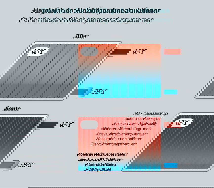Sowohl wassergeführte als auch elektrische Flachheizkörper haben seit den klobigen Heizelementen von vor 50 Jahren einen weiten Weg zurückgelegt. Um die Leistung von wassergeführten Heizkörpern zu verbessern, wurden sie beispielsweise mit engeren Wasserkanälen sowie mit mehr und größeren Konvektionsblechen für eine schnellere Wärmeabgabe ausgestattet. Moderne Heizkörper weisen eine bis zu 87 % höhere Materialeffizienz in W/kg Stahl auf.