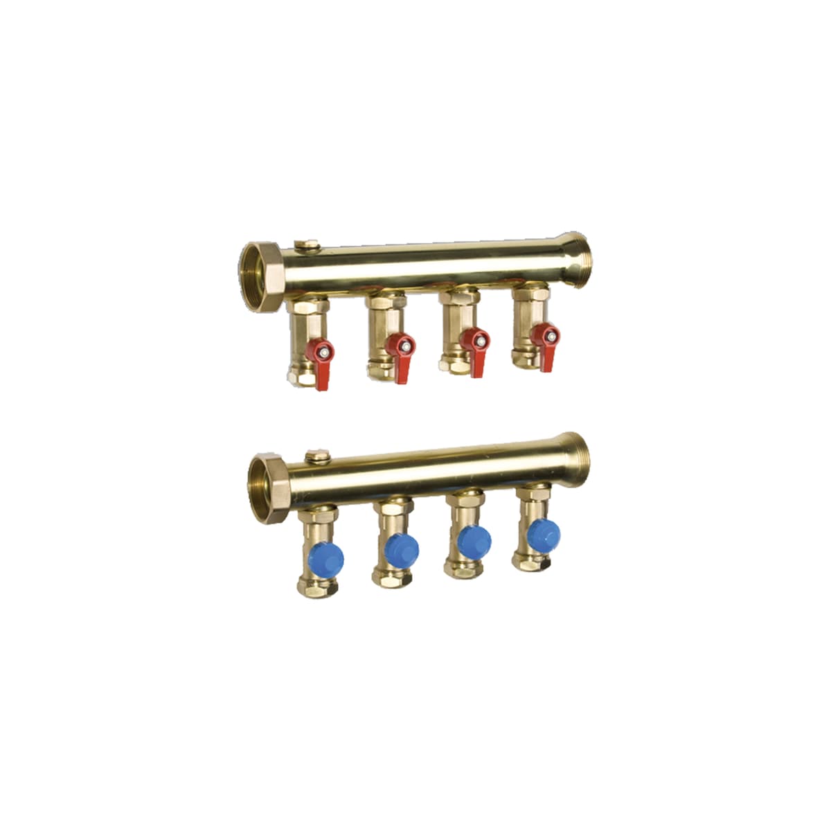 Modularer Verteiler für industrielle Fußbodenheizung. Hergestellt aus hochwertigem Messing Ms 63, entzinkungsbeständig. Modularer Aufbau, mit einerseits flachdichtendendem Außengewinde 2 "und andererseits Überwurfmutter 2". Abgänge mit Klemmverschraubung für PexPenta Heizrohr 25 x 2,3 mm, Abstand 80 mm, Stopfen 1/2 "in Vor- und Rücklaufsammelbalken zur Anbringung eines KFE-Hahns, Kugelabsperrhahn im Vorlauf, Regulierventil mit Voreinstellung im Rücklauf, druckgeprüft im Differenzdruck-Prüfverfahren, kartonverpackt. Die Verteilermodule können flachdichtend miteinander verschraubt werden, um die Anzahl der Abgänge entsprechend zu erhöhen.