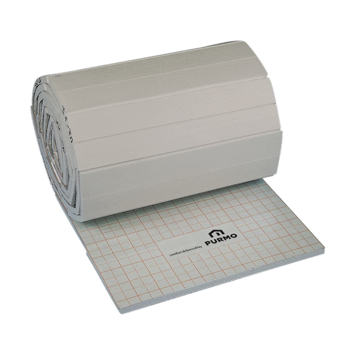 Die Purmo rolljet S Wärme-Trittschall-Dämmrollen werden aus einem speziellen Polystyrolschaum gemäß DIN EN 13163 und mit einer Wärmeleitfähigkeit von 0,032 W/mK hergestellt. Die Deckschicht besteht aus einer Verbundfolie mit längsseitigem 30 mm breitem Folienüberstand und integriertem Ankergewebe, das den Widerhakenclips sicheren Halt gibt. Ein aufgedrucktes, maßgerechtes Verlegeraster erleichtert das Zuschneiden der Dämmung und die Rohrverlegung.