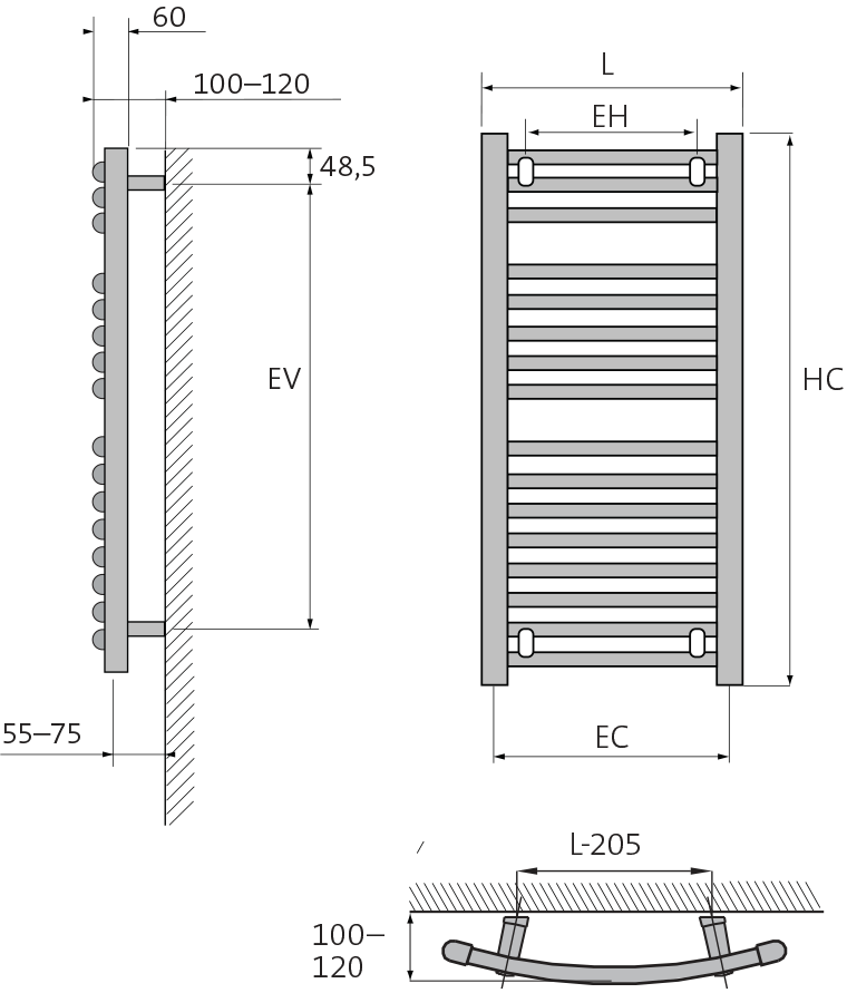 | Mudel | Horisontaal-torude arv | Võimsus dt 32,7°C (W) | Võimsus dt 50°C (W) | Laius L [mm] |