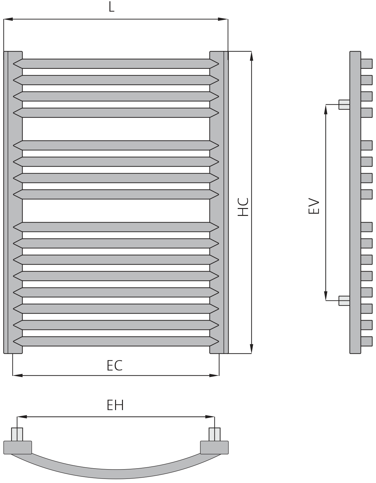 | Mudel | Horisontaal-torude arv | Võimsus dt 32,7°C (W) | Võimsus dt 50°C (W) | Laius L [mm] | Kõrgus HC [mm] | Paigaldus-mõõdud EH [mm] | Paigaldus-mõõdud EV [mm] | Ühendus-mõõdud EC [mm] |
