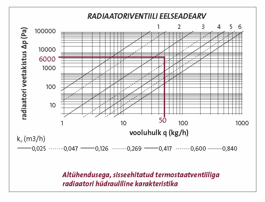 karakteristikud radiaatori ja ventiili komplekti kohta. Need karakteristikud on toodud lisatud nomogrammil.