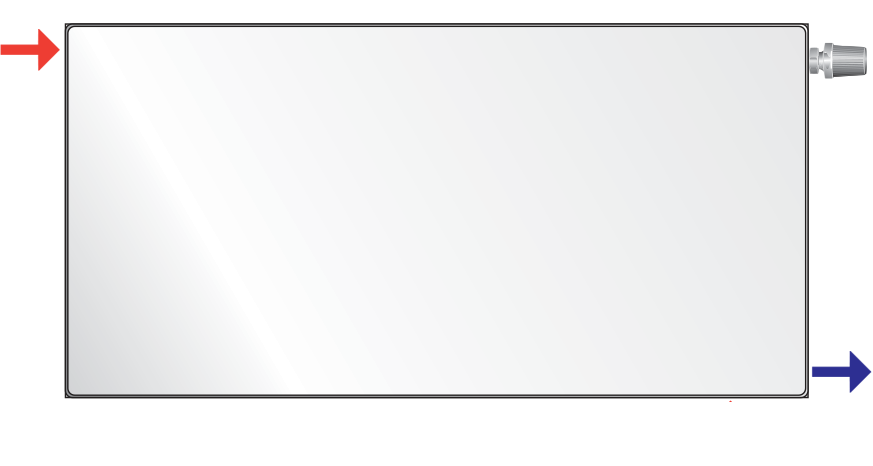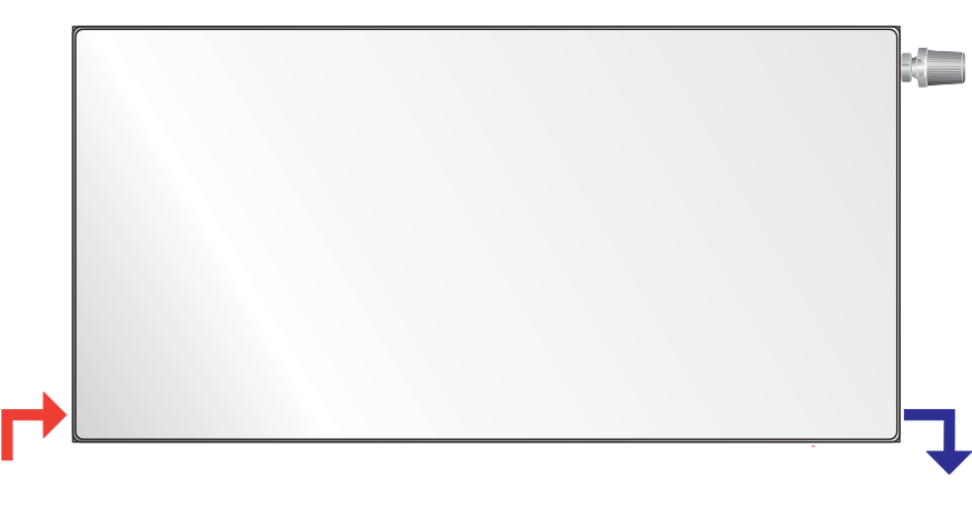 Diagonaalühendus:Soovituslik radiaatoritele üle 2000mm ning ka neile, mille pikkus ületab kõrguse neljakordselt. Selline ühendusviis tagab soojuse ühtlase jaotuse kogu radiaatori kõrguse ulatuses. Sissevool tuleb ühendada üles ning väljavool alla. Vastupidisel ühendusel väheneb radiaatori soojusväljastus üle 30%. Diagonaalühenduse kasutamiseks tuleb eemaldada radiaatori termostaatventiil. |