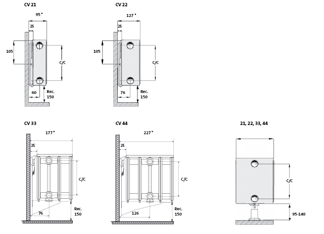 | Radiaatoritüübid: | CV11, CV21, CV22 ja CV33. Kõrgus 200: CV/FCV/FFCV21, CV/FCV/FFCV22, CV/FCV/FFCV33, CV/FCV/FFCV44. |