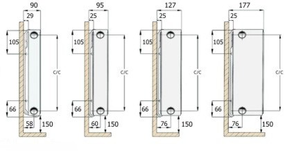 C/C = Radiaatori kõrgus miinus 50 mm.