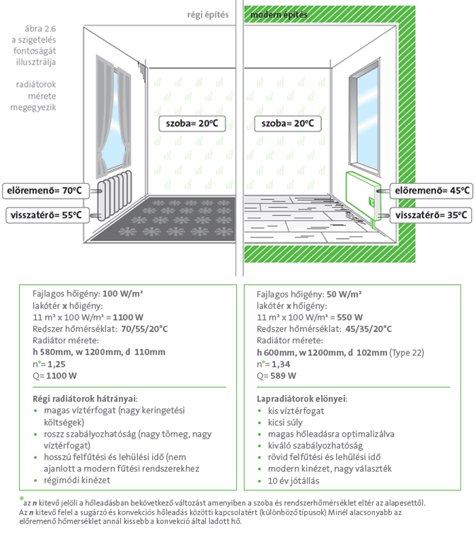Az épületek elmúlt évtizedekben megnövekedett energia hatékonysága lehetővé tette a radiátorok tervezési hőmérsékletének a csökkentését. Az ábrán látható radiátorok méretei nagyjából megegyeznek. Az elvárt beltéri hőmérséklet mindkét esetben ugyan annyi. Ahogy az látható, egy szigeteletlen ház esetén a kívánt hőmérséklet eléréséhez az előremenő és visszatérő víz hőmérséklete jóval magasabb, mint a megfelelő szigetelésű ház esetében. Ennek előnye, hogy a modern szoba esetén a radiátor mérete változatlan maradhat a szigetelés utáni kisebb hőigénynek köszönhetően.