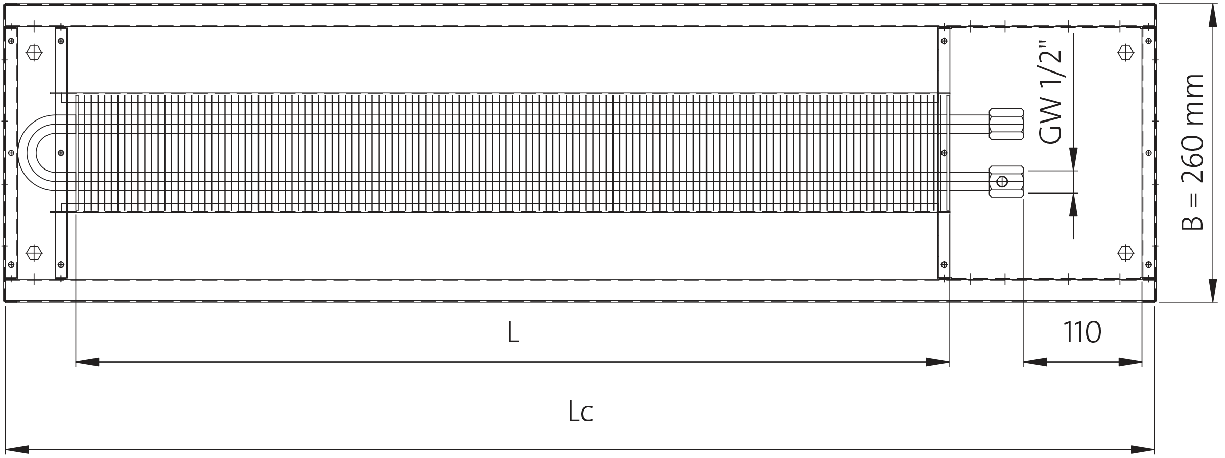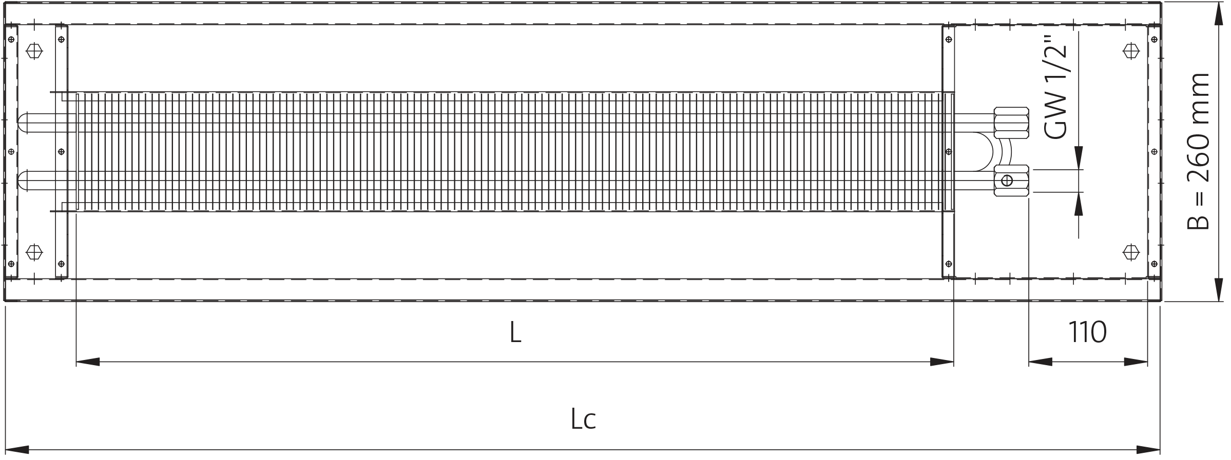 Канальные конвекторы Aquilo FMK предназначены для монтажа в полах обогреваемых помещений. Нагревательным элементом является медно-алюминиевый теплообменник, окрашенный в черный цвет, установленный в стальной ванне, оцинкованной с обеих сторон, с внутренней стороны также окрашенной в черный цвет. Сверху конвектор закрыт поперечной или продольной декоративной решеткой, изготовленной из предлагаемого производителем материала, которая заказывается отдельно. Подключение конвектора к системе отопления выполняется с помощью двух патрубков G ½".