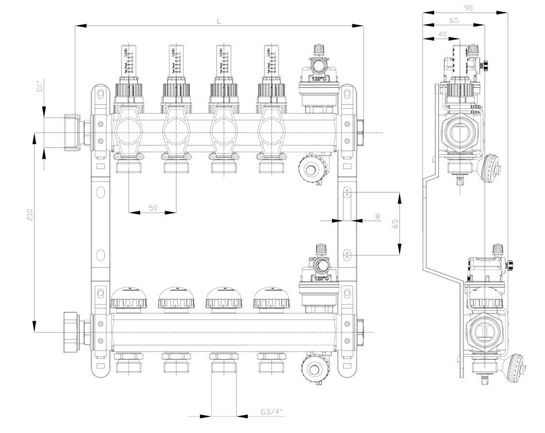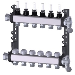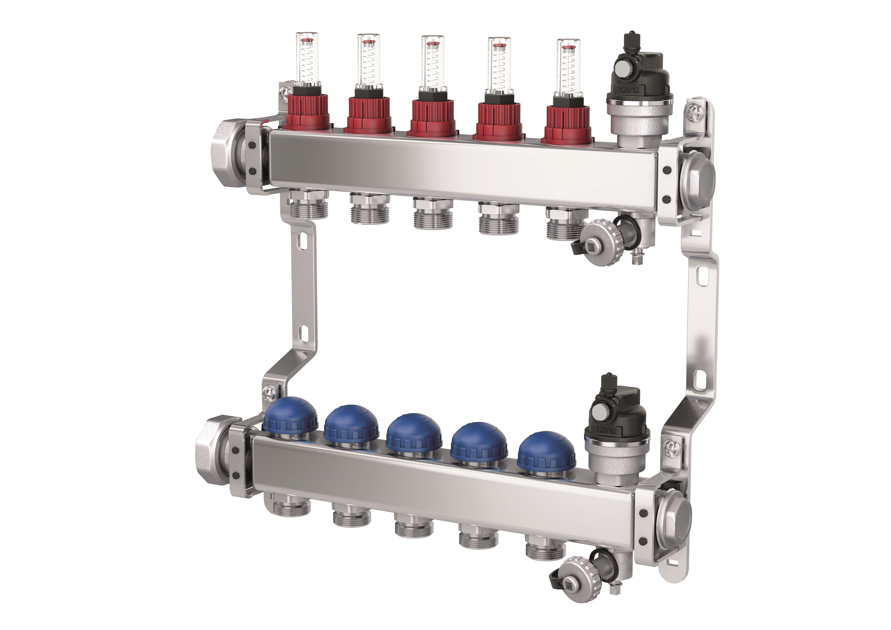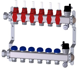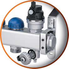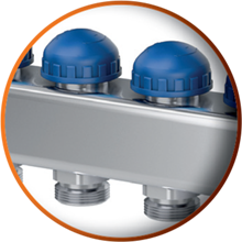 Коллектор оснащен современным автоматическим безопасным воздухоотводчиком , который сам удаляет воздух из системы. Это чрезвычайно ценный элемент, особенно в системах стенового или потолочного отопления и охлаждения -  там, где ручное удаление воздуха намного сложнее, чем в системе напольного отопления.