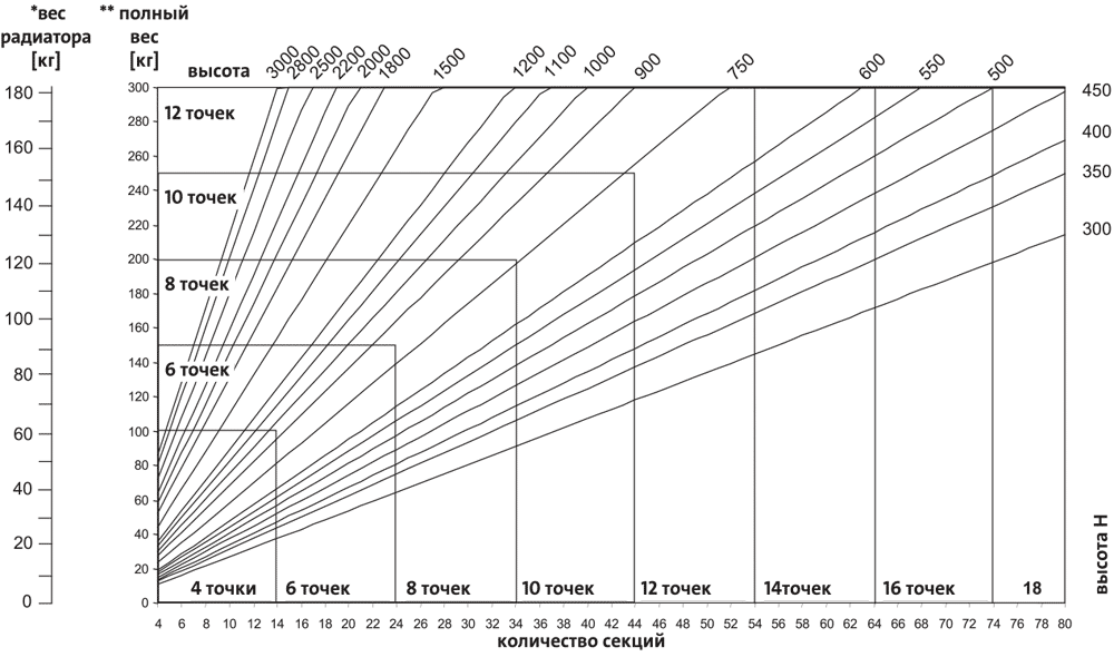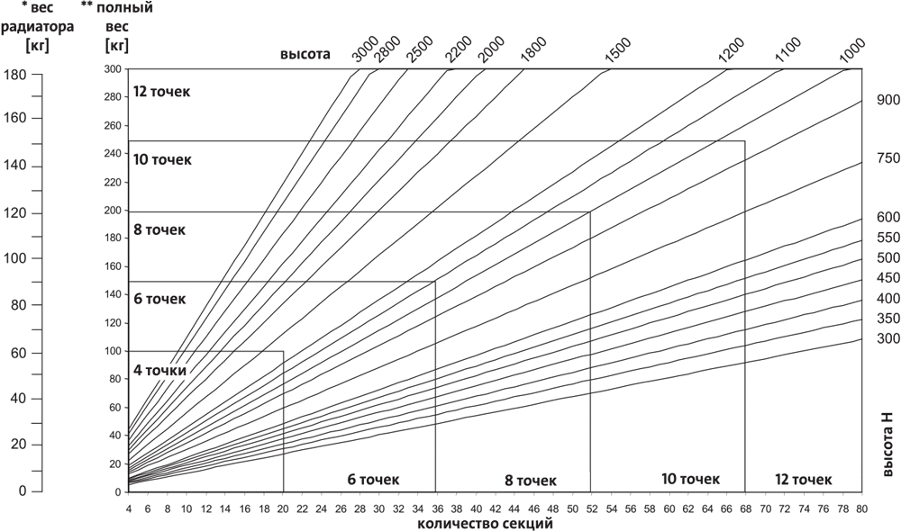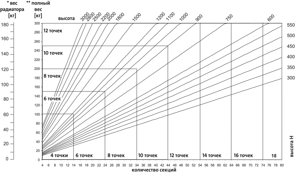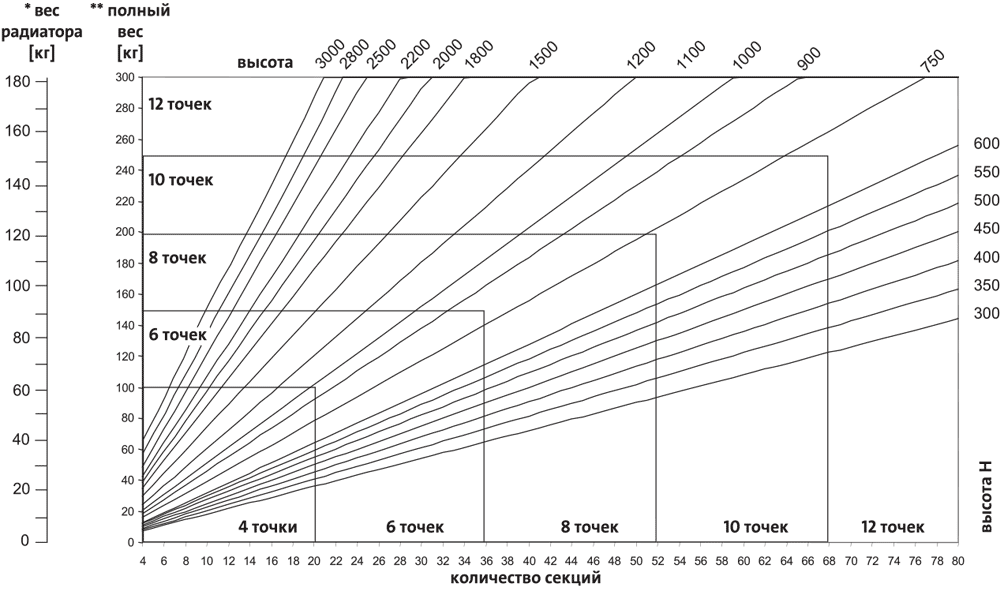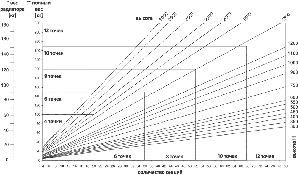 НОМОГРАММЫ для определения требуемого количества точек креплений для 2-, 3-, 4-, 5-, 6-трубных радиаторов