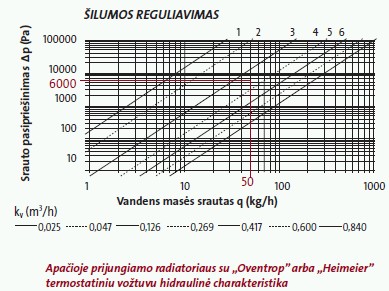 Pratekėjimui q = 50 kg/h ir slėgio praradimui 600 dPa nomogramoje nuskaitome įžanginio nustatymo vertę 3.