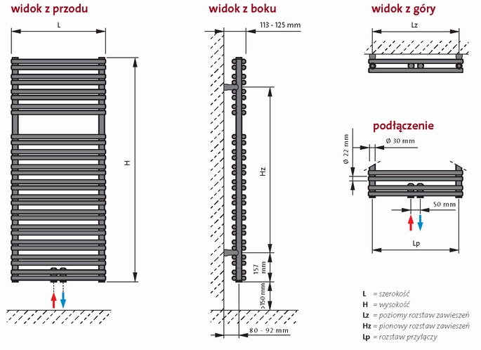 Zawieszenia | Rozstaw przyłączy Lp [mm] | Pojemność wodna [dm³] |