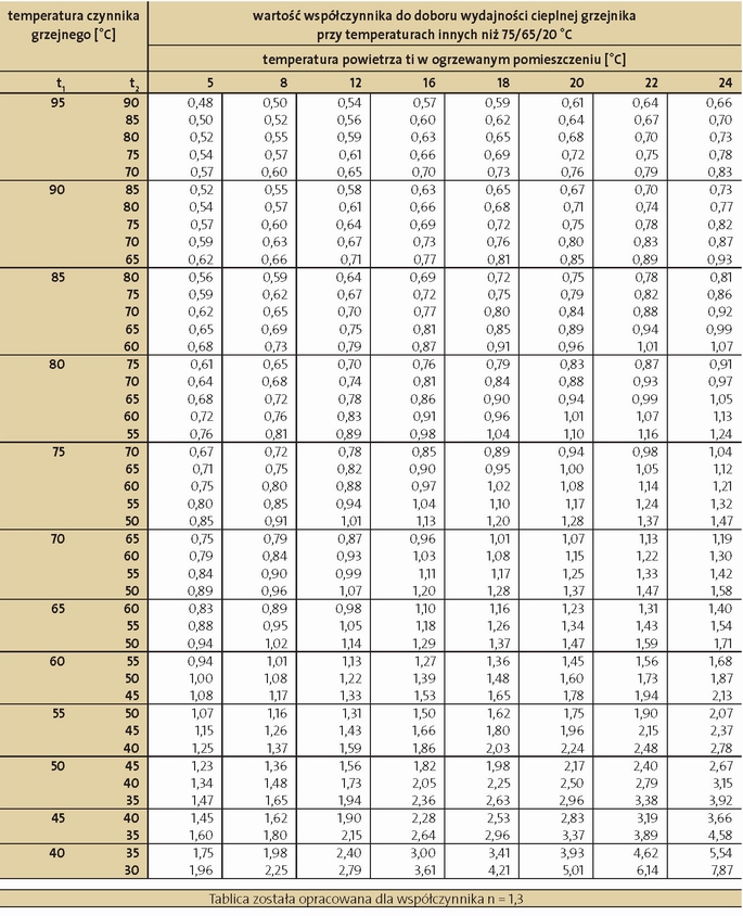 Obliczeniowe zapotrzebowanie na ciepło pomieszczenia wynosi 800 W. Projektowana temperatura wody zasilającej grzejnik wynosi 55°C, a powracającej z grzejnika 45°C. Projektowana temperatura powietrza w pomieszczeniu wynosi 20°C. Dla parametrów 55/45/20°C odczytujemy współczynnik korekcyjny 1,96. Mnożąc obliczeniowe zapotrzebowanie na ciepło (800 W) przez współczynnik korekcyjny (1,96),otrzymujemy moc cieplną (1568 W), według której dobieramy grzejnik dla parametrów 75/65/20°C.