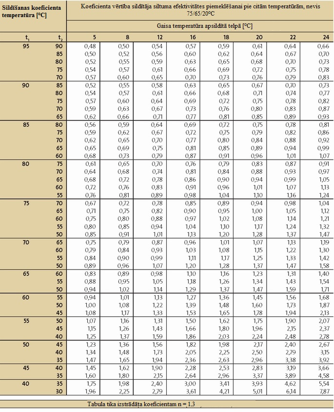 Aprēķināmā telpas siltuma nepieciešamība sastāda 800 W. Projektētā ūdens temperatūra, kas apgādā sildītāju sastāda 55oC, bet atgriezeniskā no sildītāja ir 45oC. Projektētā gaisa temperatūra telpā sastāda 20oC. Parametriem 55/45/20oC nolasām korektīvo koeficientu 1,96. Reizinot aprēķināmo siltuma nepieciešamību (800 W) ar korektīvo koeficientu (1,96), iegūstam siltuma jaudu (1568 W), pēc kura tad arī izvēlamies sildītāju, kas atbilst parametriem 75/65/20oC. Tas nozīmē, ka projektētais sildītājs parametriem 55/45/20oC sasniegs siltuma jaudu 800 W, bet parametriem 75/65/20oC attiecīgi 1568 W jaudu.
