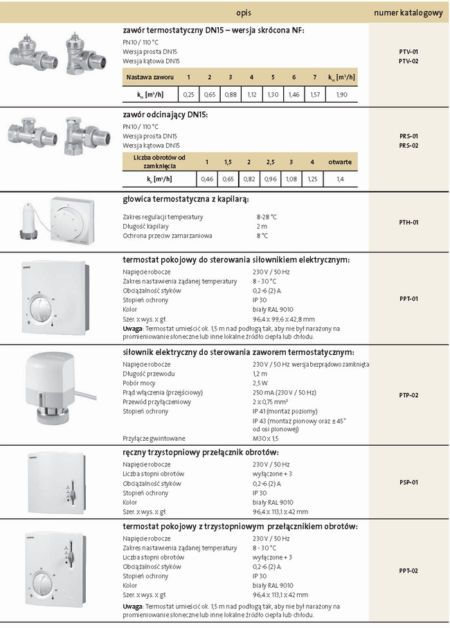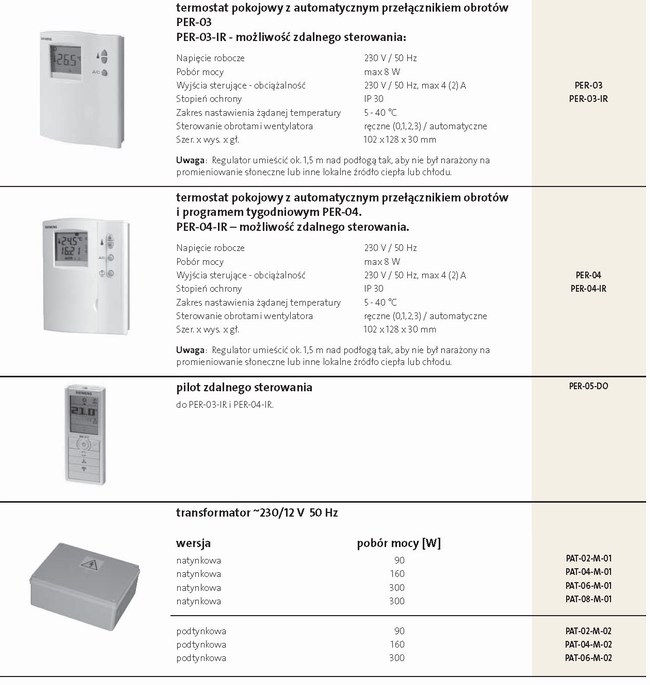 Kod zamówienia Opis 1. Regulacja mocy cieplnej po stronie powietrza 1.1 PSP-01 Przełącznik ręczny obrotów wentylatora 1.2 PPT-02 Termostat pokojowy z ręcznym przełącznikiem obrotów 1.3 PER-03 Termostat pokojowy z automatycznym przełącznikiem obrotów 1.4 PER-04 Termostat pokojowy z automatycznym przełącznikiem obrotów i programem tygodniowym
