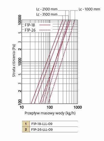 Moc cieplna [W] grzejników kanałowych Aquilo F1P przy temperaturze powietrza w ogrzewanym pomieszczeniu ti=20°C.