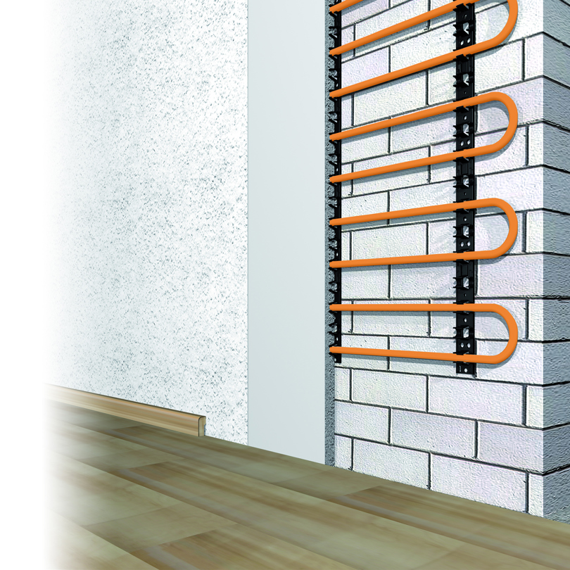 System Railjet to system specjalnie zaprojektowany do użycia na różnych podłożach, takich jak ściany. Gdy podłoże składa się z betonu, natryskiwanego Pur lub płyt izolacyjnych. System Railjet zawsze oferuje bardzo solidne mocowanie. Listwa montażowa umożliwia rozstaw rur w wielokrotnością odległości co 5 cm.