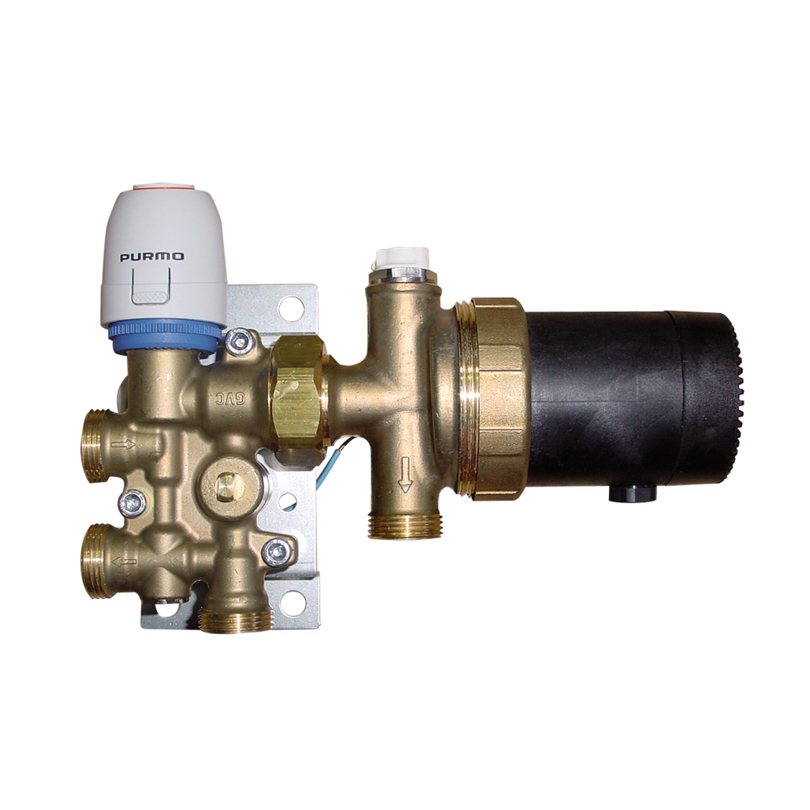 Zestaw regulacyjny przeznaczony do bezpośredniego podłączenia jednej lub dwóch pętli ogrzewania podłogowego do instalacji grzejnikowej. Jest idealnym rozwiązaniem w sytuacjach, gdy „podłogówka” jest potrzebna tylko w jednym pomieszczeniu np. w łazience, kuchni lub w pokoju dziennym. Mały zestaw obniża temperaturę wody z np.70°C do temperatury właściwej dla instalacji ogrzewania podłogowego np. 40°C. Pompa zapewnia potrzebny przepływ wody w obiegach ogrzewania podłogowego, a ogranicznik temperatury nie pozwala, by temperatura zasilania przekroczyła 55°C. Temperaturę powietrza w pomieszczeniu można regulowac za pomocą głowicy termoelektrycznej, podłączonej do termostatu.