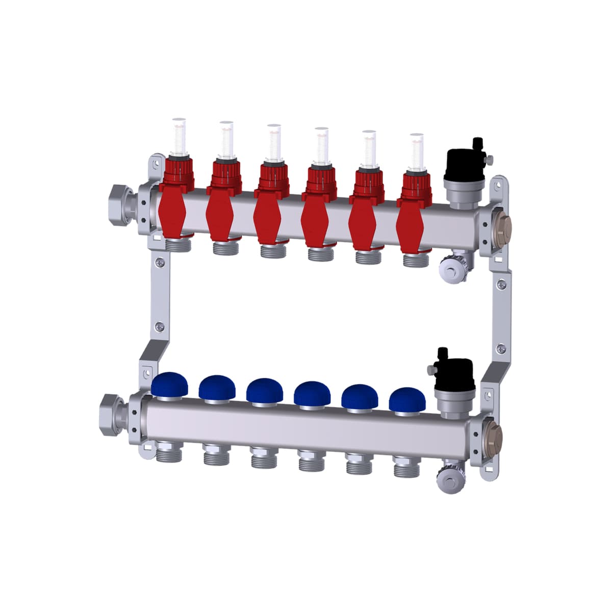 Distribuitorul de încălzire Premium Line, pre-asamblat este partea cea mai importantă a unui sistem de încălzire în pardoseală. Distribuitorul poate fii ușor integrat în orice sistem, ceea ce reduce timpii de montaj în șantier. Include ventilele de sectorizare pe fiecare circuit pe tur și retur, debitmetre și aerisitor automat, asigurănd o instalare ușoară și o întreținere redusă.