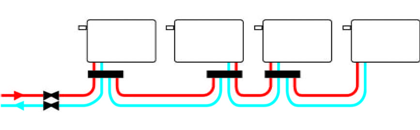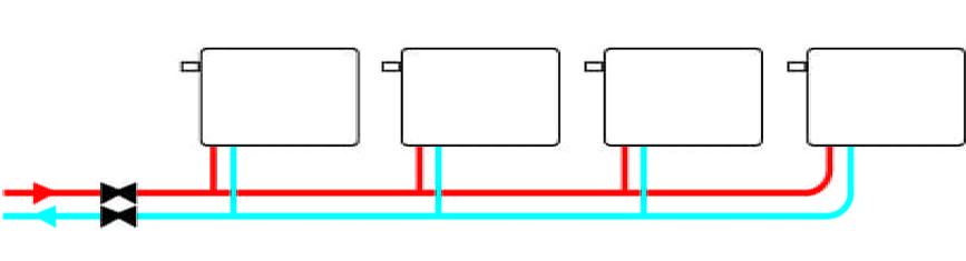 Det installationsmässigt enklaste systemet. Rördragning med mjuka stål- eller kopparrör. Observera dock att detta system ställer krav på en riktigt utförd dimensionering. Då medelövertemperaturen för respektive radiator längs slingan sjunker måste kompensering med större radiatoryta ske. Injustering av radiatorerna är ej nödvändig. Slingreglerings-/avstängningsventiler placeras i början och slutet av slingan eller före första respektive efter sista radiatorn i slingan. Manuell dimensionering radiatorer hittas lägre ned på sidan.