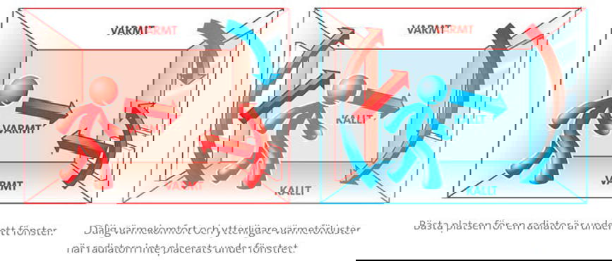 Bästa platsen för en radiator är under ett fönster, för då förhindras kallras. Radiatorns värmestrålning kompenserar även för kylan från den kallare fönsterytan. Radiatorer finns i standard utförande och med slät panel front. Vill du ha ett riktigt kraftpaket kan du välja en konvektor. Och söker du en snygg inredningsdetalj kan du välja en sektionsradiator. Alla dessa passar under ett fönster.