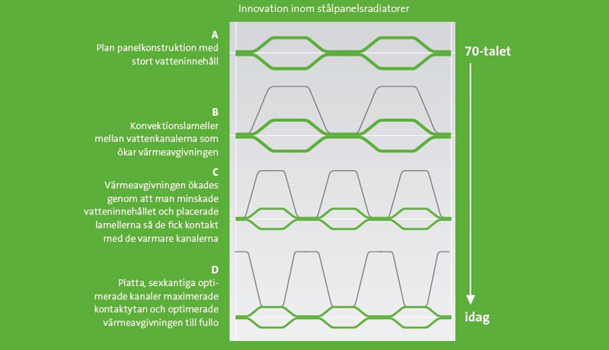 Radiatorerna har utvecklats mycket sedan de klumpiga värmeelementen för 50 år sedan. Tidiga stålpaneltyper hade en plan panelkonstruktion med högt vatteninnehåll (A). Därefter följde införandet av konvektorflänsar mellan vattenkanalerna, som ökade deras värmeavgivning (B). Under årens lopp upptäckte man att värmeavgivningen kunde ökas genom att minska vatteninnehållet och att placera flänsarna i kontakt med de varmare kanalerna (C). Inte förrän kanalerna plattades till i den sexkantiga optimerade form som vi ser idag, som kontaktytan kunde maximeras och värmeavgivningen optimeras fullständigt (D).