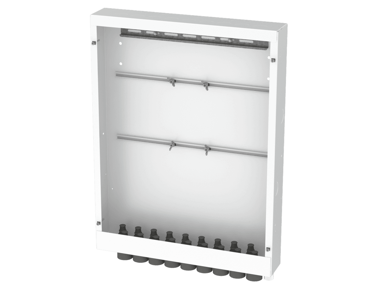 Fördelarskåp för säker och dold installation. Läckageindikering ansluts via utgång i skåpets botten. Rörgenomföringar, täckskivor med mera finns som tillbehör.