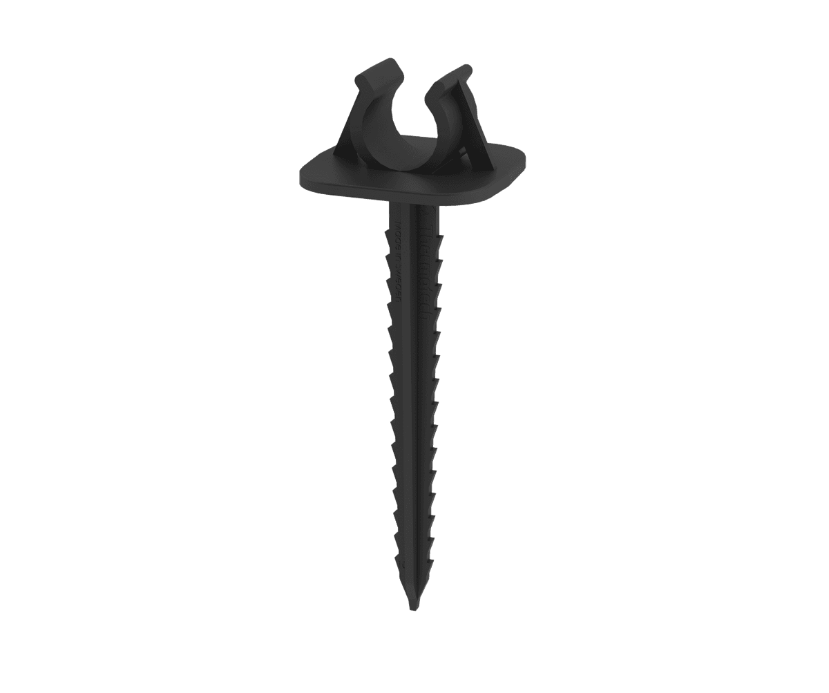 Rörhållare i plast för infästning av golvvärmerör mot cellplast med minst 100mm tjocklek. Plasten i denna produkt är till 50% återvunnen av spill från skyddsrören i rör-i-rör tillverkning.