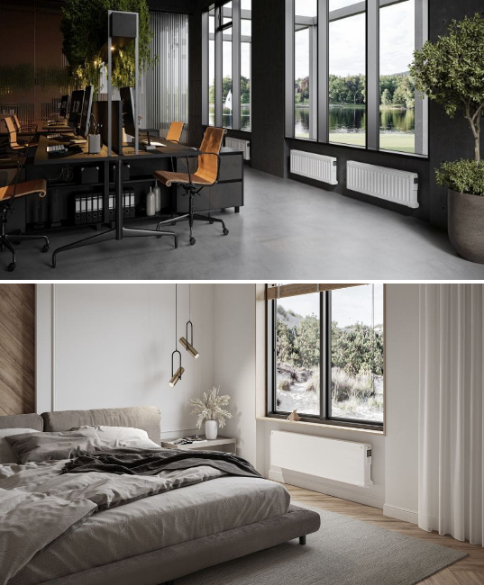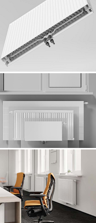 Purmo Flex доступний у 3 різних дизайнах. Plan Flex має плоску передню частину для витонченої та сучасної обробки. Для тих, хто віддає перевагу структурам, є Ramo Flex з тонким профільованим фасадом. Кожен із цих дизайнів доступний у різноманітних розмірах і кольорах, тому дуже легко вибрати радіатор Purmo Flex, який ідеально поєднується з дизайном інтер’єру кімнати.