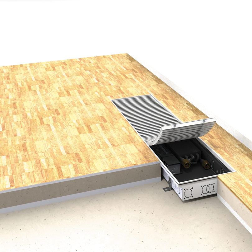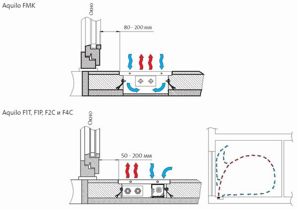 Aquilo F1S - траншейний конвектор для монтажу в підлогу, додатково оснащений вентилятором. Призначений для систем водяного опалення. Використовується в тих випадках, коли немає можливості встановити традиційні радіатори на стінах приміщення, зазвичай встановлюється під великими вікнами чи вітринами. Має вистоту 75мм або 110 мм, кілька варіантів ширини та асортимент довжин від 700 до 3000 мм. Aquilo F1S оснащені безшумними вентиляторами, які забезпечують примусову циркуляцію повітря та вищу тепловіддачу. Вентилятори приводяться в дію двигунами 24В. Зверху радіатор захищений поперечною або поздовжньою маскувальною решіткою, яка замовляється окремо. Доступні матеріали решітки - дерево (дуб і бук) та дюралюміній в кольорах: світло-коричневий, темно-коричневий, чорний. Гарантійний термін на комвектор становить 10 років а на всі електричні компоненти та елементи керування – 2 роки.
