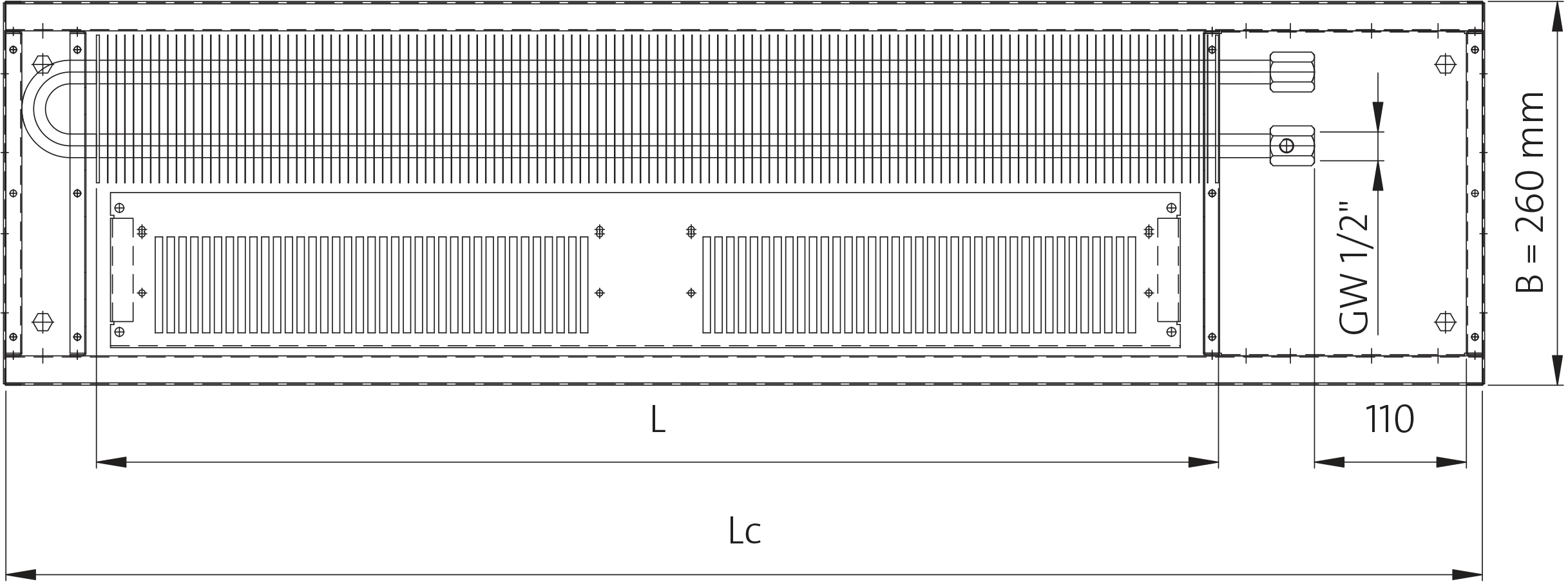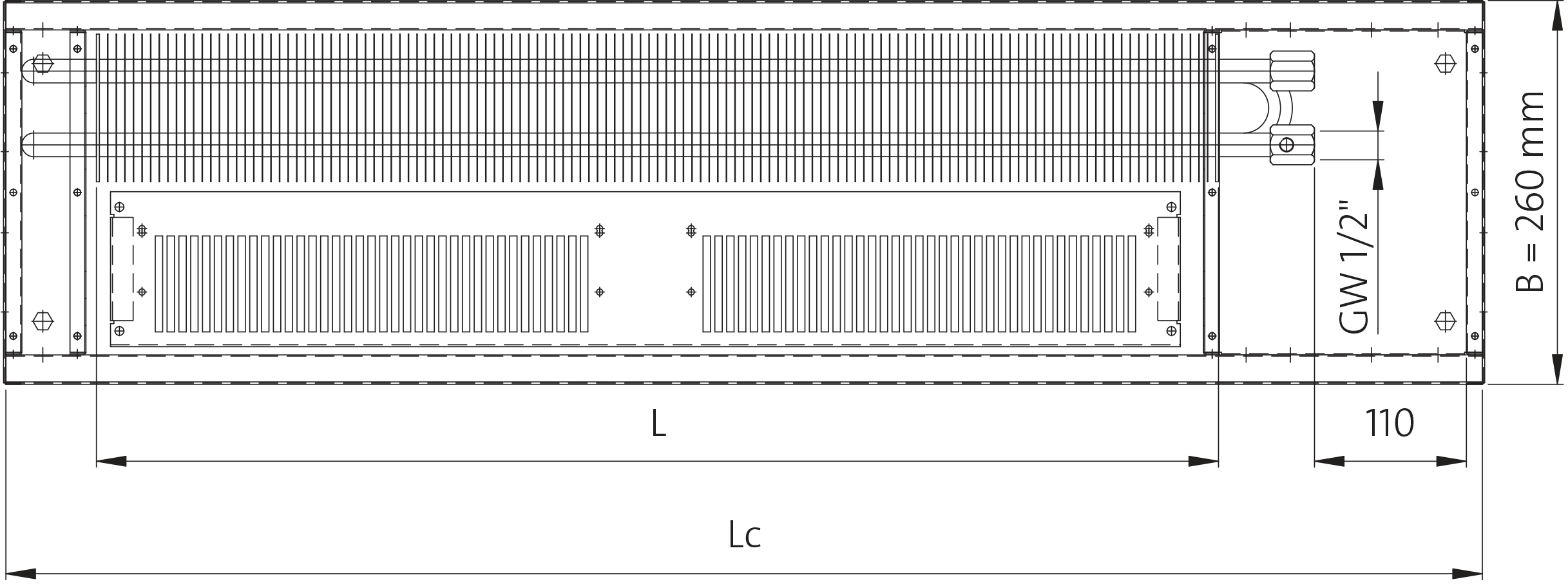 радиатор типа Aquilo FMT, высота 90 мм, ширина 260 мм, длина 1500 мм, ванна из оцинкованного металлического листа, исполнение стандартное