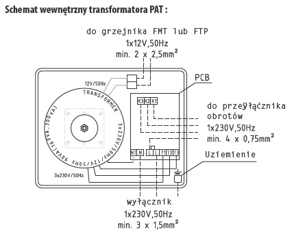 Максимальная длина провода между радиатором Aquilo FMT/FPT и трансформатором (PAT) составляет 10 м. В случае необходимости превышения этой длины необходимо использовать провод большего сечения, нежели рекомендуемый, с тем, чтобы падение напряжения составляло не более 1,0 В (рекомендуемая величина – ок. 0,5 В). Цепь питания трансформатора должна быть предохранена установочным выключателем типа S301 D 6 A. Трансформатор в исполнении на штукатурку (PAT-xx-M-01) необходимо подсоединить к цепи питания двужильным проводом 2 х 1,5 мм2, а трансформатор в исполнении под штукатурку (PAT-xx-M-02) необходимо подсоединить проводом 3 х 1,5 мм2 (например, типа YDY или YKY). Предохранительный зажим находится внутри корпуса. Кроме того внутри находится трубчатый плавкий предохранитель, предохраняющий обмотку трансформатора. Соединение трансформатора PAT с термостатом, оборудованным 3-ступенчатым переключателем скорости вращения, необходимо выполнить проводом 5 х 0,75 мм2. Для подсоединения проводов в ванне конвектора Aquilo FMT/FPT служат зажимные планки в коробке (1-2 шт. в зависимости от количества вентиляторов).