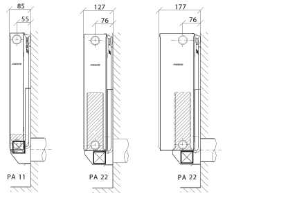 PURMOAir PA11 призначений для встановлення з радіатором PURMO C11, V11 або DF11. Він оснащений гребінчастою перемичкою, яка спрямовує потік повітря у проміжок між конвекційними ребрами і панеллю радіатора.