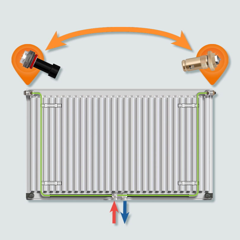 центральне приєднання:Радіатори з нижнім приєднанням можна приєднувати одночасно до бокових і нижніх штуцерів. Можливі посередні варіанти: бокове і діагональне показані на рисунках. |