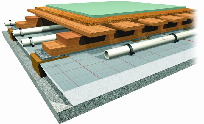 В случае применения эластичных полов, уложенных на деревянных стропилах), используются маты изоляции rolljet или faltjet и трубы Purmo. Система позволяет свободно укладывать контуры напольного отопления между опорными точками стропил эластических полов. Клипсы Purmo и крепежная сетка системной изоляции обеспечивают надежную фиксацию греющим трубам и их правильную работу в пространстве деревянной конструкции.