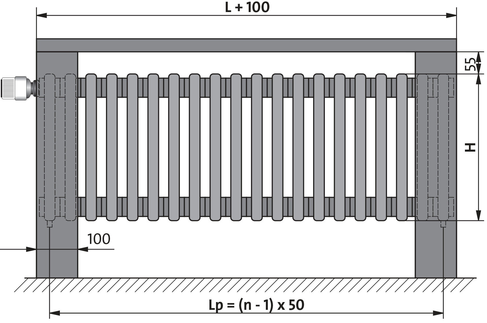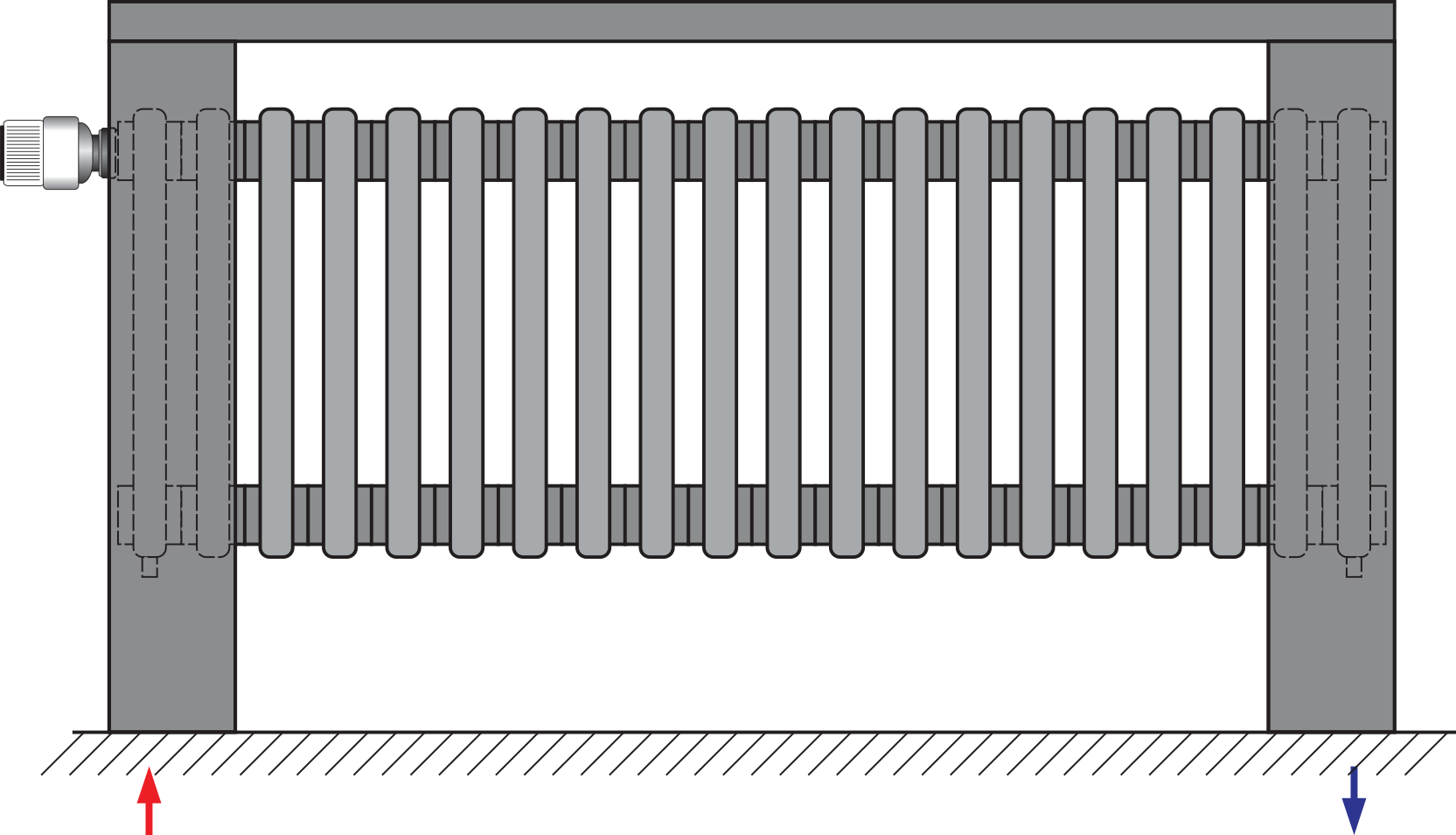 | Подключение: | подача – слева снизу в крайней секции, внутренняя резьба G ½ дюйма; вывод – справа снизу в крайней секции G ½ дюйма; радиатор Column Bench V укомплектован термостатической клапанной вставкой с предварительной настройкой вместе с термостатической головкой с соединительной резьбой M 30x1,5 мм – слева вверху; воздушный клапан с резьбой G ½ дюйма – с правой стороны сверху. |