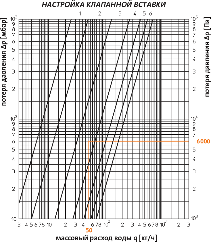 Для течения q = 50 кг/ч и потери напора 6000 Па считываем