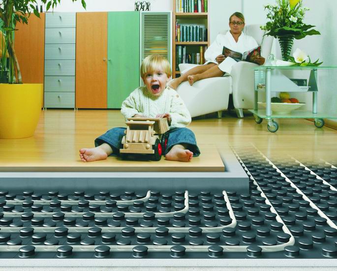 Между конструкцией здания (потолком) и стяжкой пола с отопительными трубами должен быть размещен слой изоляции, который также является и звукоизоляцией. Тип и толщина изоляции зависят от местоположения и назначения помещения, а также от размера ожидаемых нагрузок стяжки.