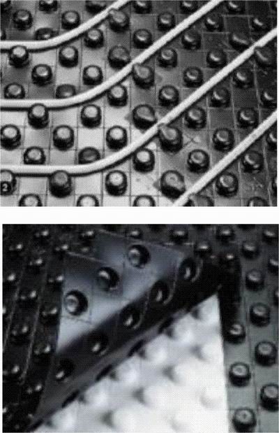 Верхний слой образован глубоко вытянутой ударопрочной полиэтиленовой пленкой, нанесенной на выступы, также называемыми nopami. Это элемент, который удерживает трубы в правильном положении.