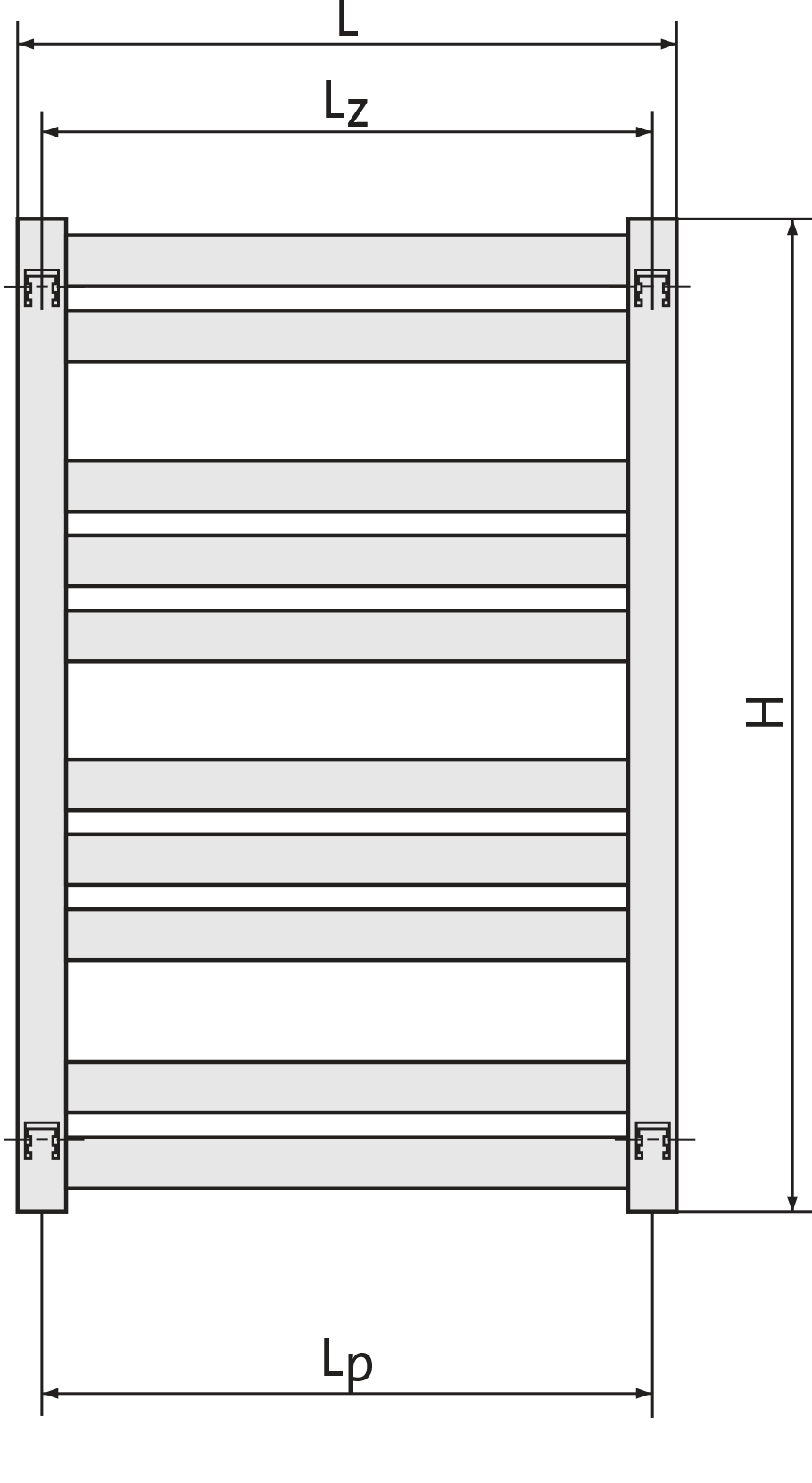 тип мощн. [Вт] 75/65/20 °C мощн. [Вт] 90/70/20 °C H [мм] L [мм] кронштейны Lp [мм] объём воды [дм³] вес [кг] кол-во гориз. трубок